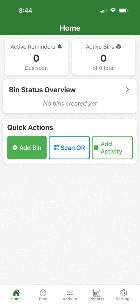 - Quick Actions – Lets you instantly add bins, scan QR codes, or log activity