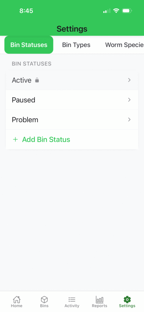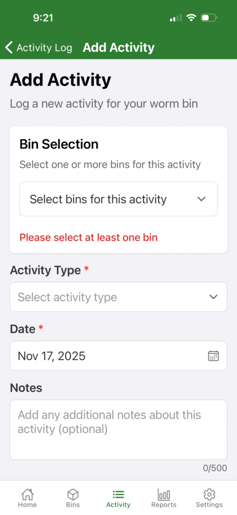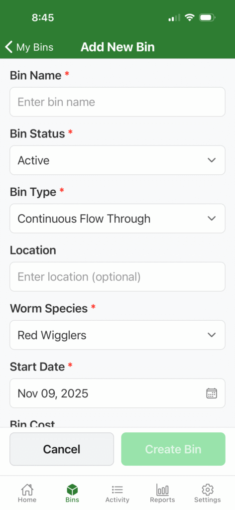 - Enter your bin name (e.g., “Red Wigglers – Indoor Bin”)