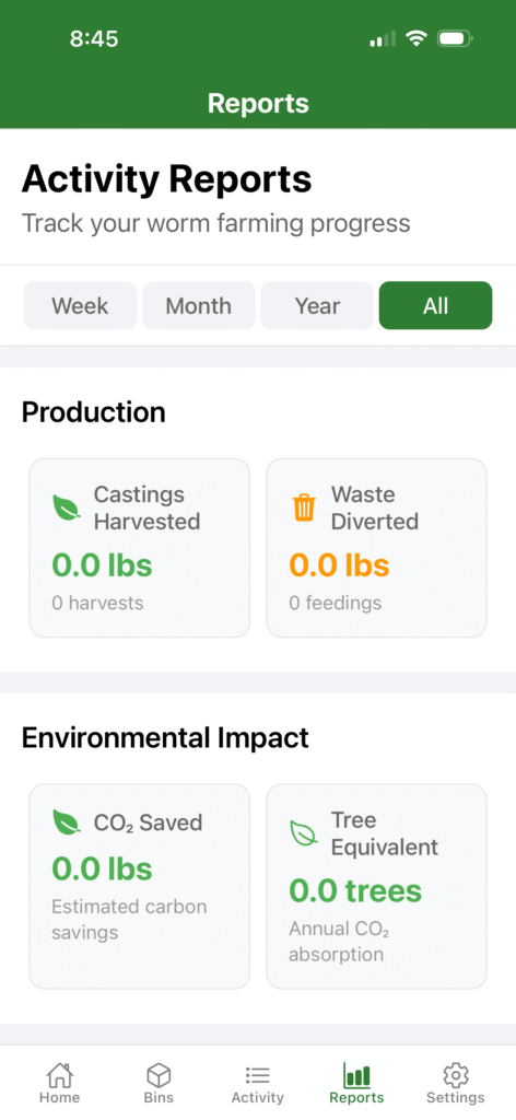When you open WiseWorm, you’ll arrive on the Home tab. This screen gives you a quick summary of your worm farm.